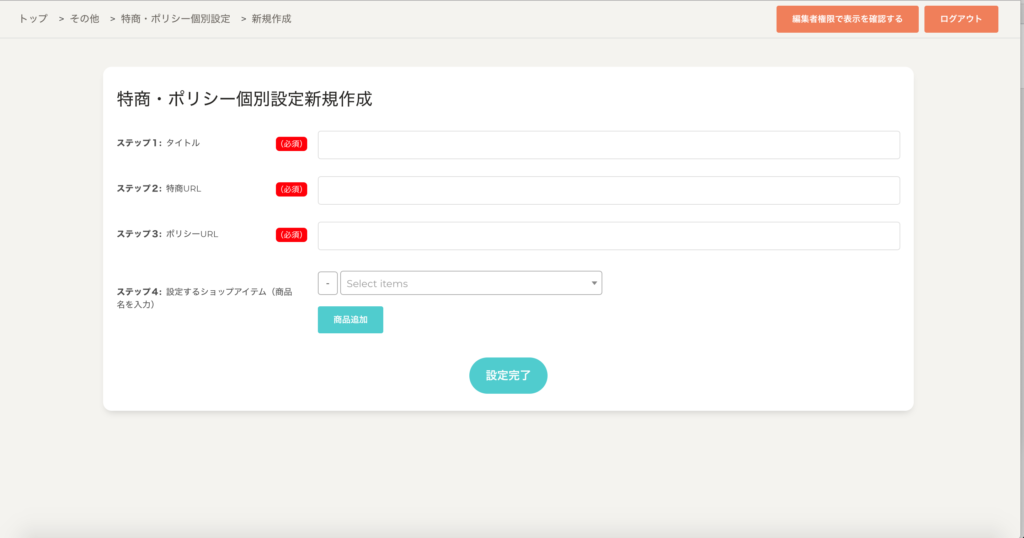 販売ページごとに、特商及びプライバシーポリシ内容を設定したい時にこちらの機能が役に立ちます。