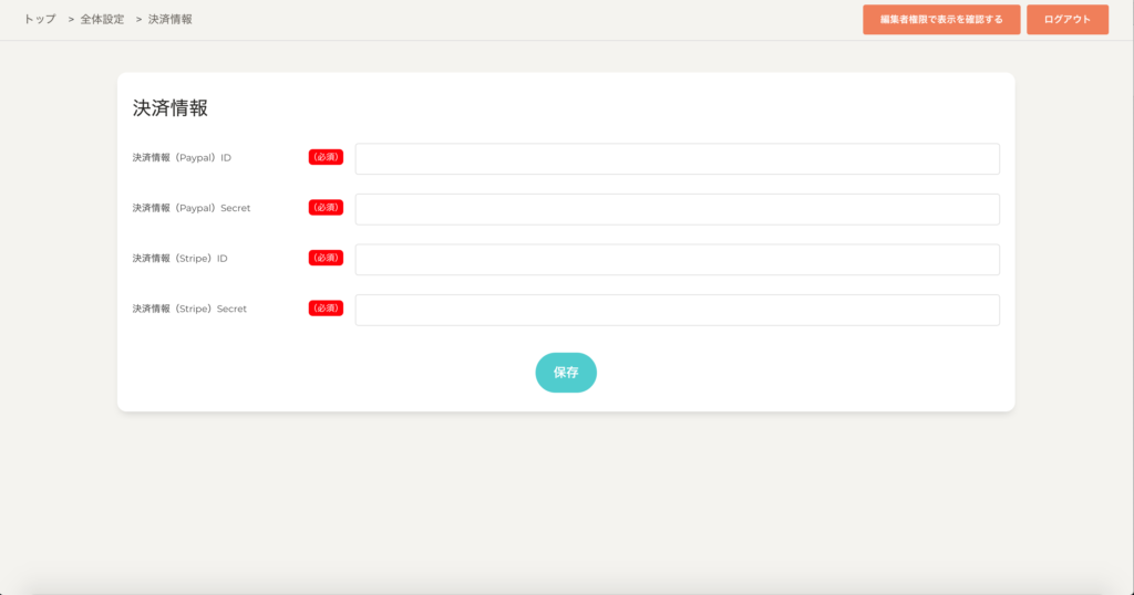 クレジットカード決済の売り上げ金額を、お持ちのpaypal及びstirpeに移行する設定を行います。こちらの設定がないと販売等ができませんので必ず設定をお願いします。