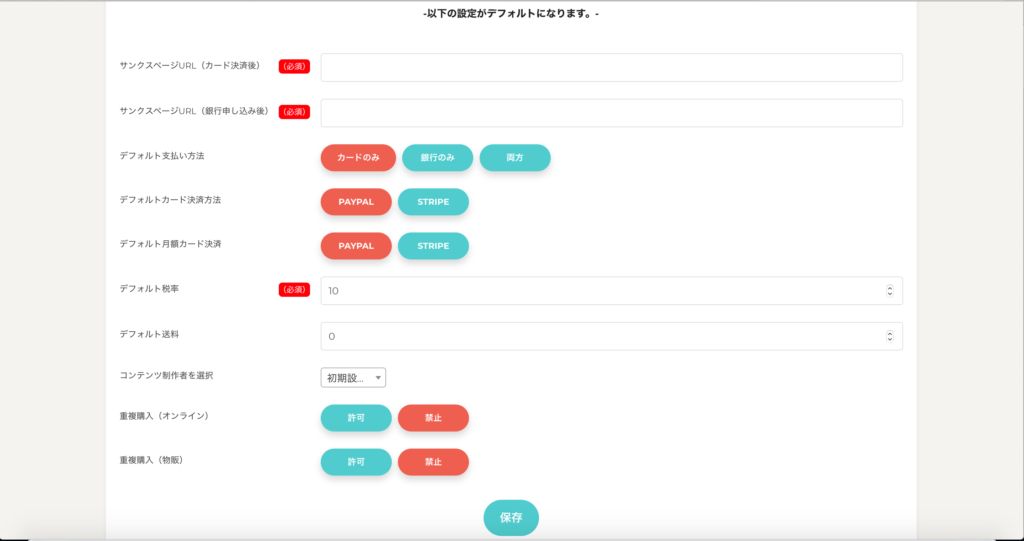 販売する際に必要な基本情報を設定します。こちらの設定がないと販売ができませんので、必ず設定をお願いします。