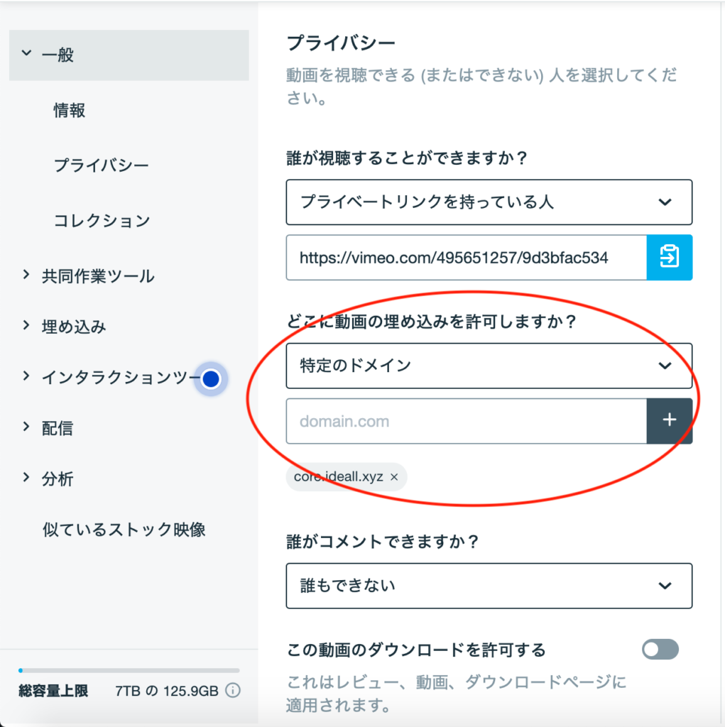 「どこに動画の埋め込みを許可しますか?」の設定を「特定のドメイン」と変更し、ビジネスΩのドメインを入れて「+」ボタンを押してください。ドメインとは、「https://」を抜いたものです。