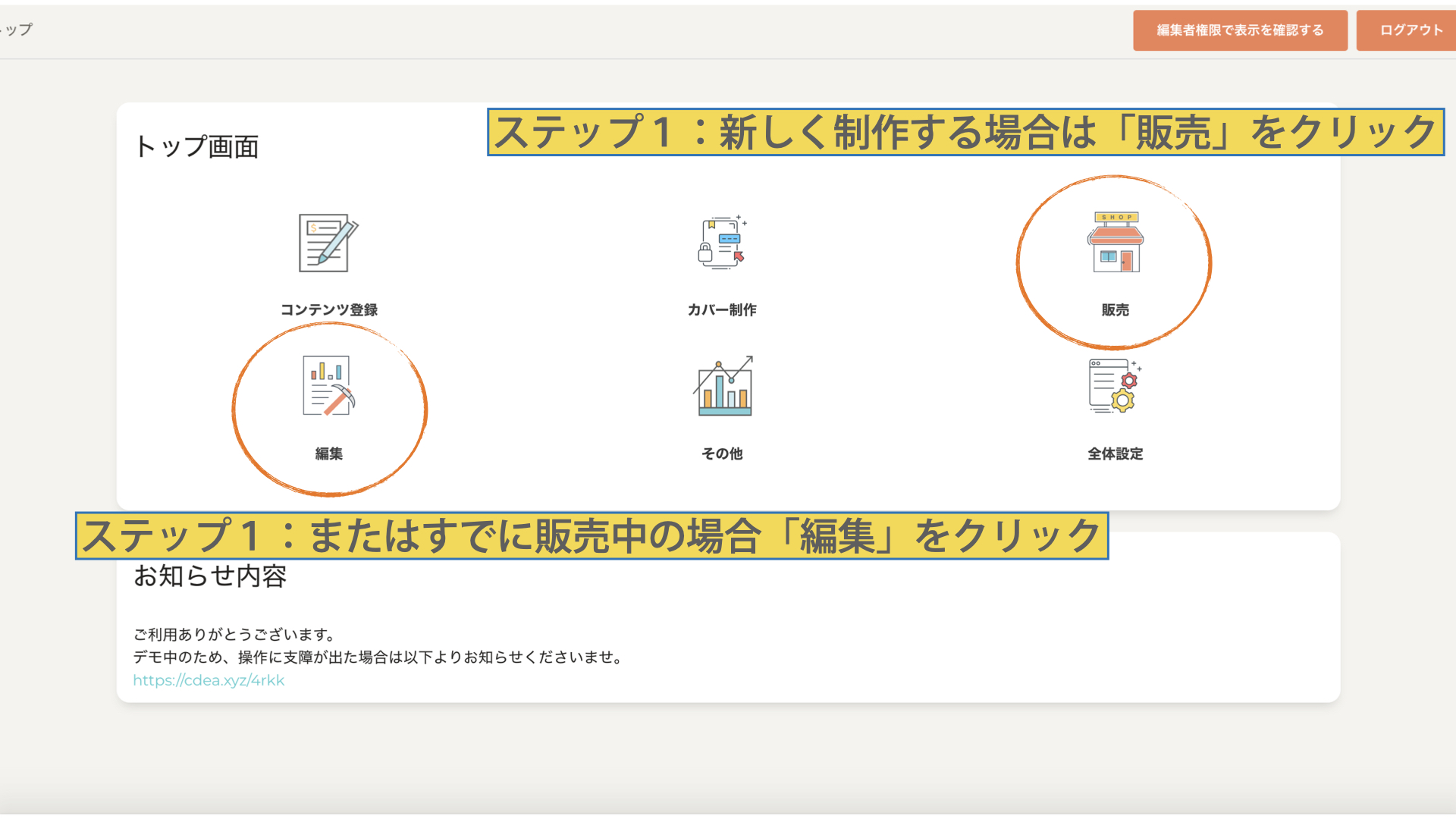 「販売」をクリック、または、すでに販売中のコンテンツがあった場合「編集」をクリック