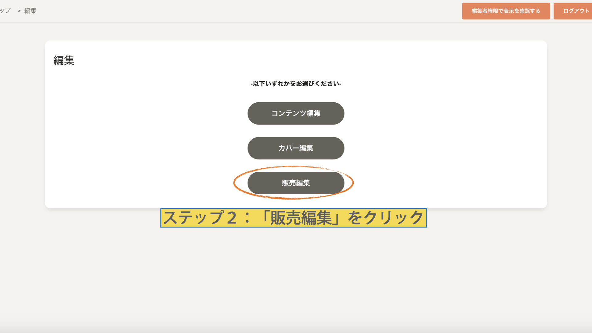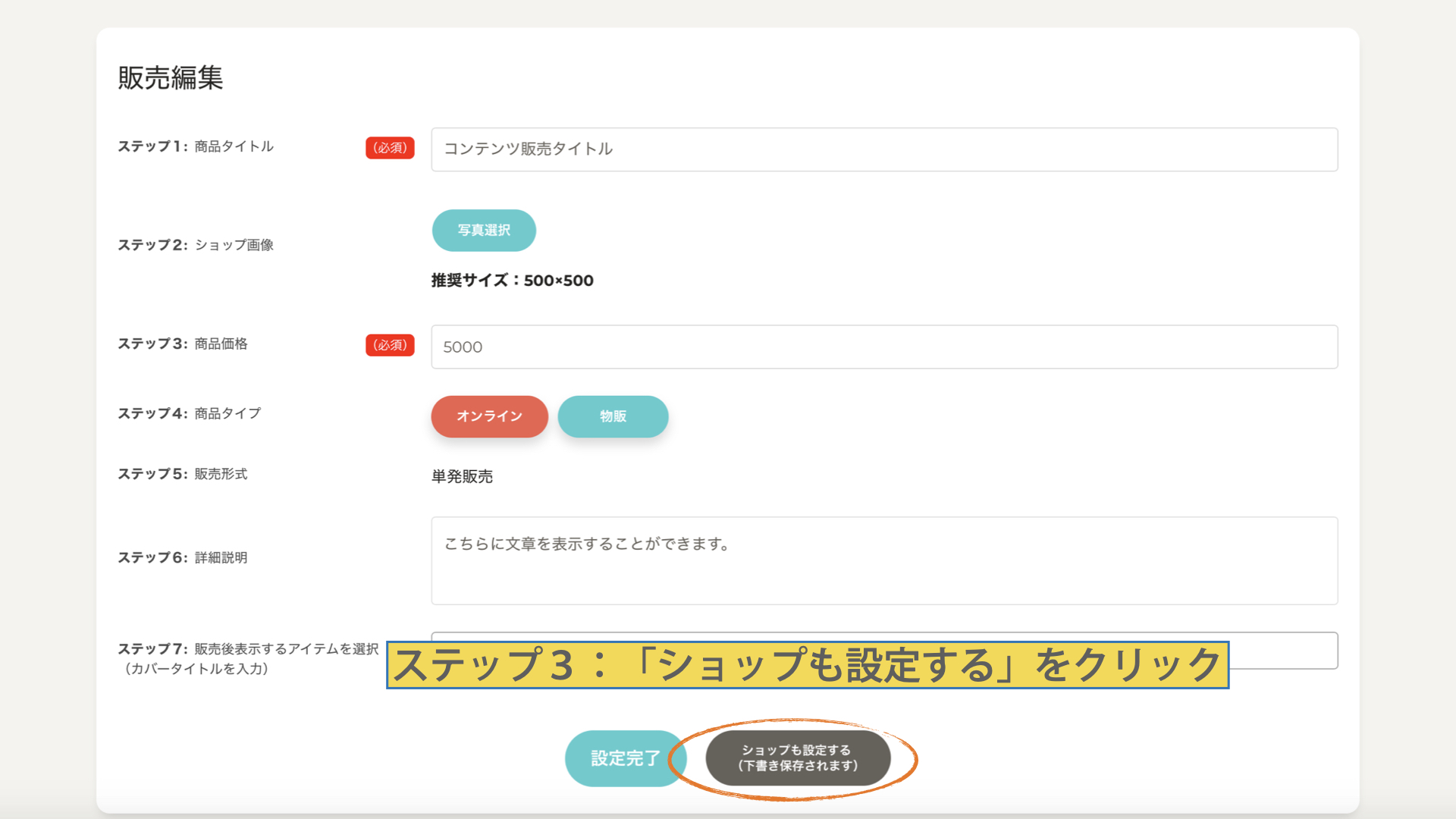 「編集」を押した場合:「販売編集」をクリックし、ショップに設定したい販売コンテンツの「編集」をクリック。「販売」とクリックした場合:こちらの方法で入力(入力のみです。登録は行わないでください。)