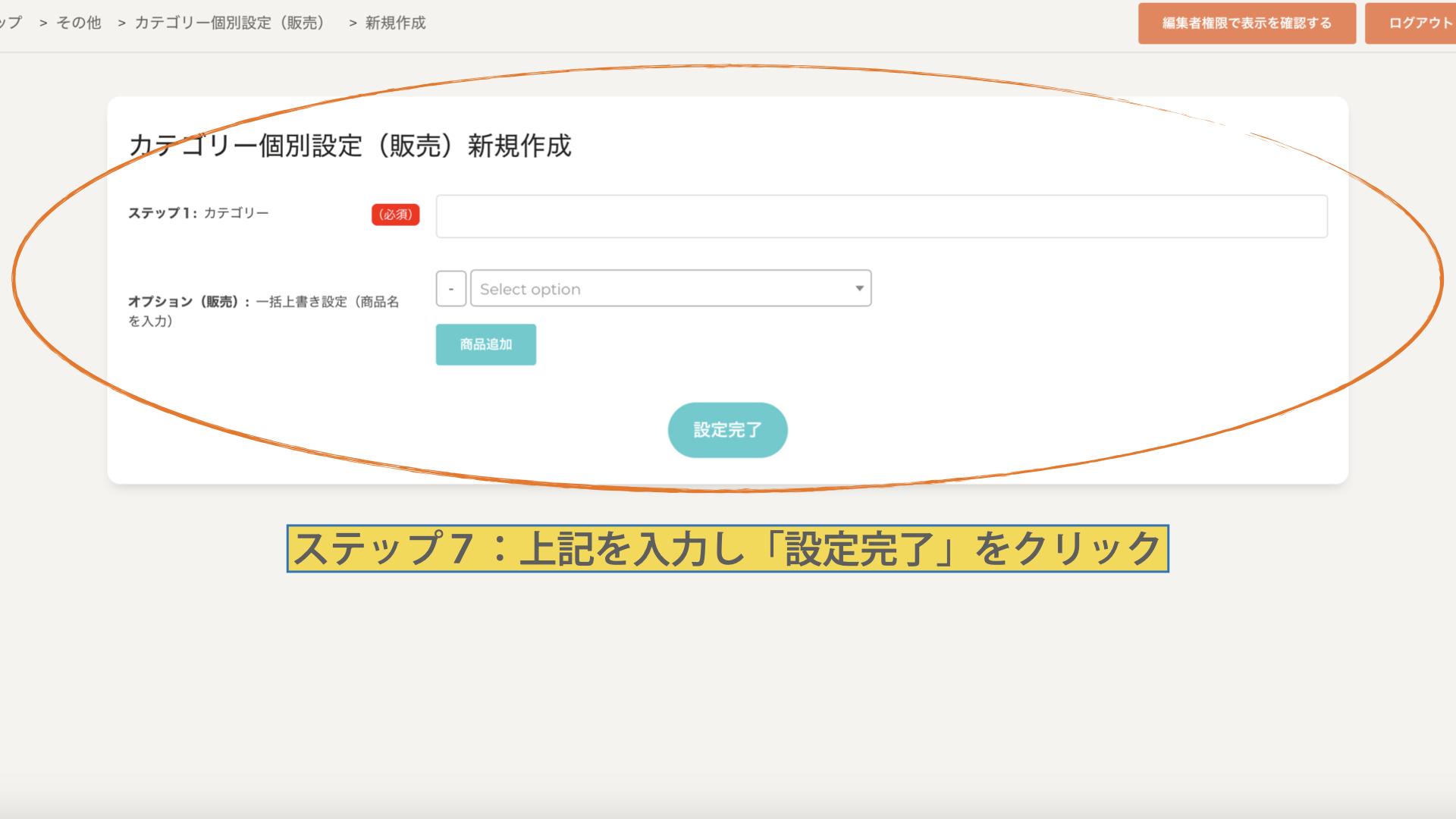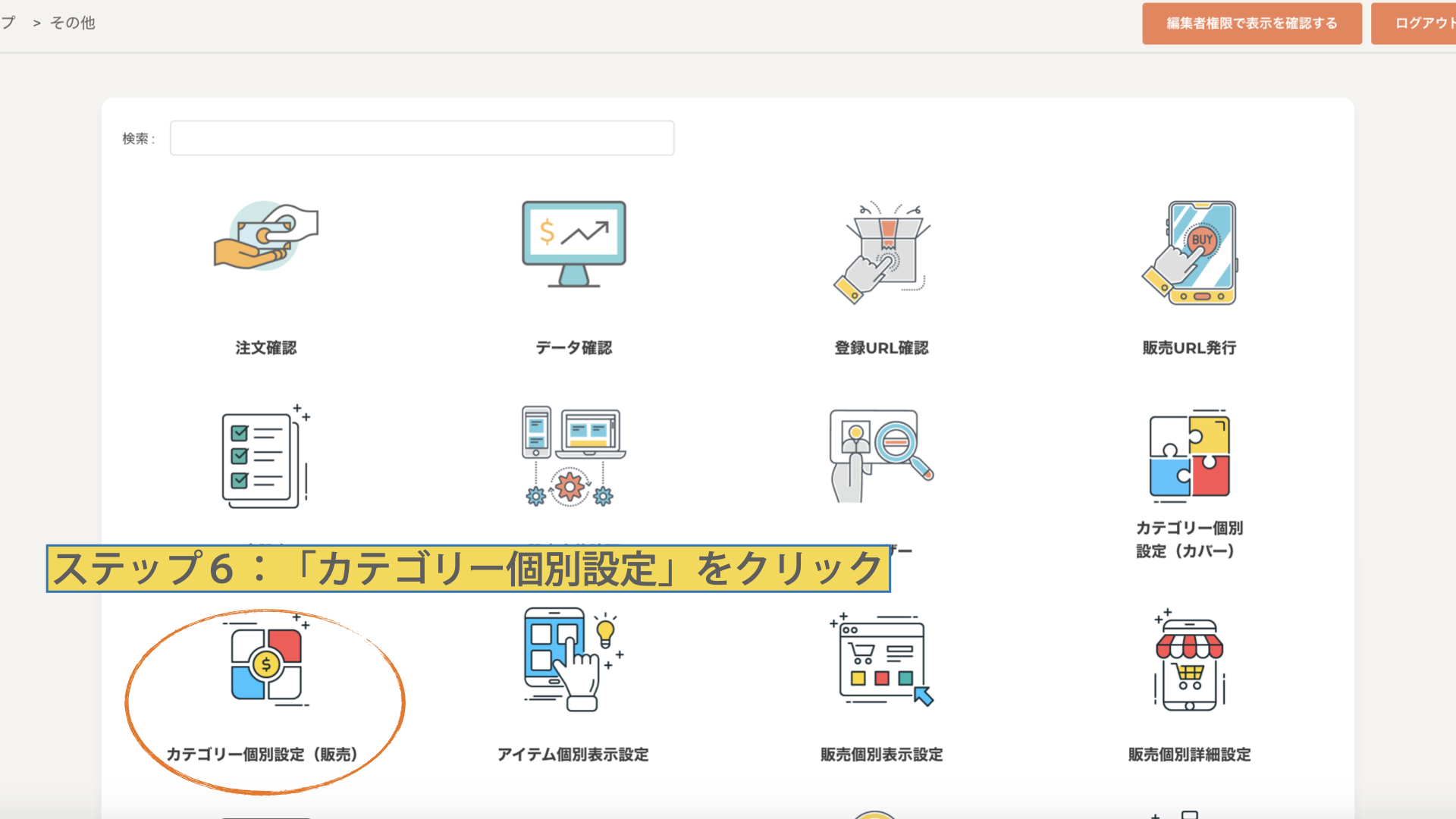 ショップページに表示するためには、ステップ4で制作したものにカテゴリーを設定する必要があります。まずは「その他」をクリックしてください。