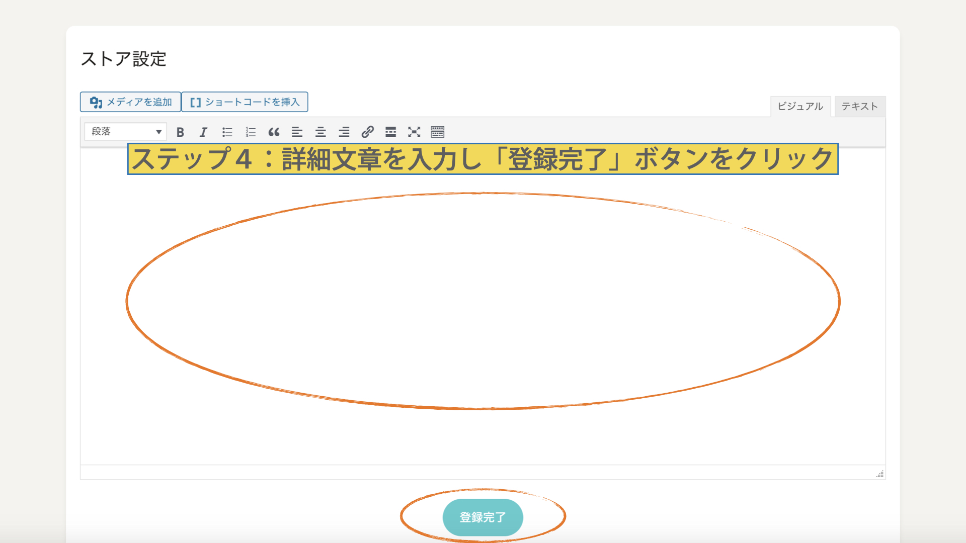 ショップページに表示する詳細文章を入力し「登録完了」ボタンをクリックする