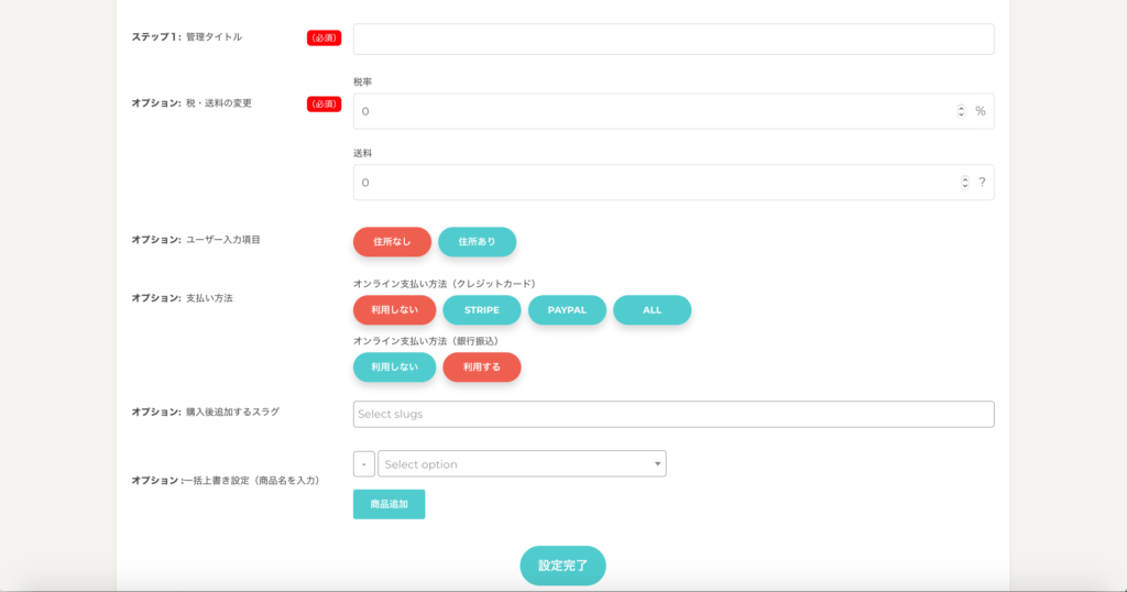 販売商品ごとに税率や送料、支払い方法などを個別に設定することができます。