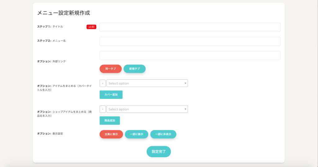 →メニューをクリックしたときに、別のサイトへ飛ばしたい場合は入力してください。同時に、「同一タブ」か「新規タブ」の表示を選択できます。