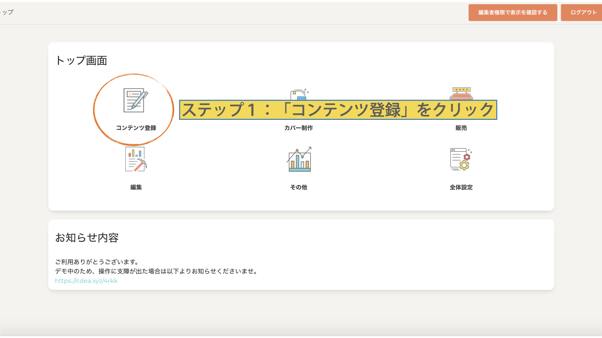 「コンテンツ登録」をクリック